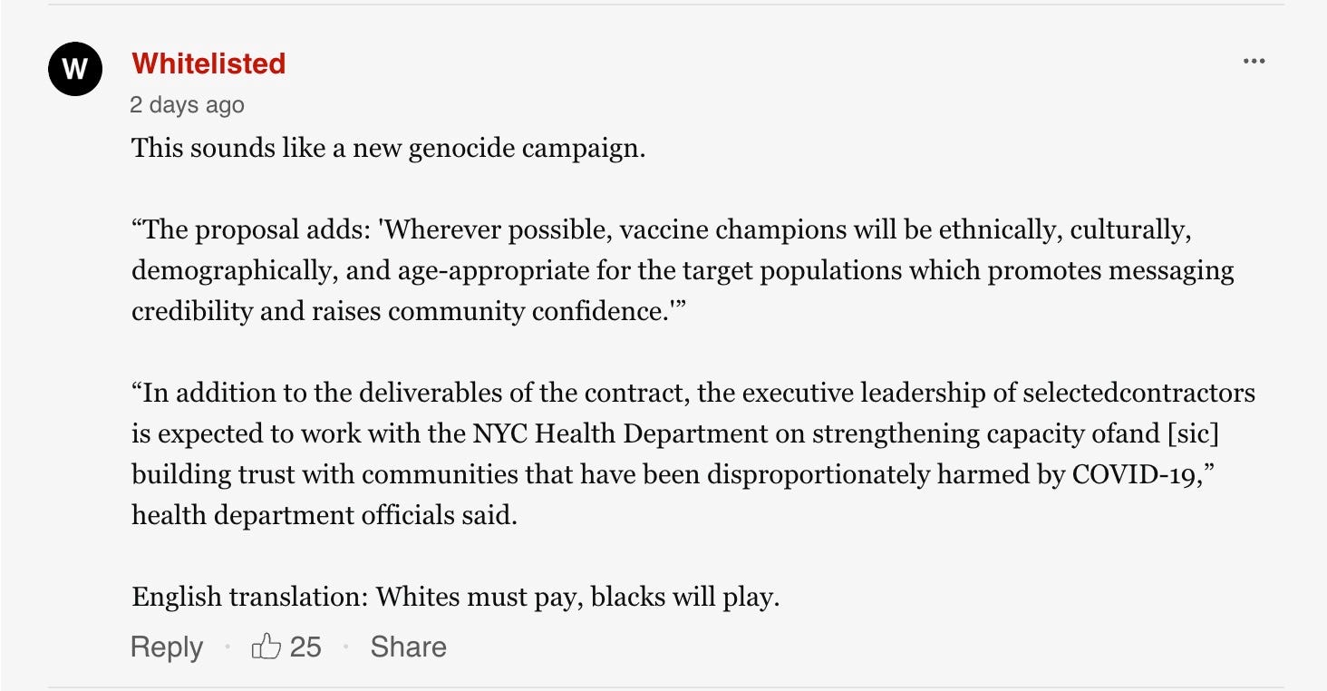 And never forget that the party of the KKK really cares about minorities, and if you take another serving of DEATHVAX™, then the Marxist gov apparatchiks will automatically enter you into a raffle, with the grand prize being the Brooklyn Bridge.