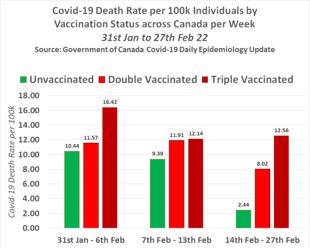 The following chart shows the Covid-19 death-rate per 100,000 individuals by vaccination status across Canada per week between 31st Jan and 27th Feb 22 based on the death figures and population size figures above –