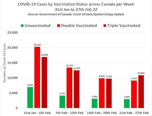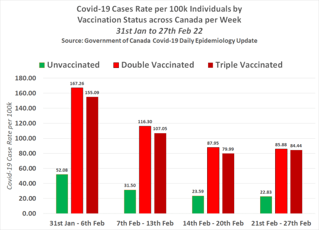 The following chart shows the Covid-19 case-rate per 100,000 individuals by vaccination status across Canada per week between 31st Jan and 27th Feb 22 –