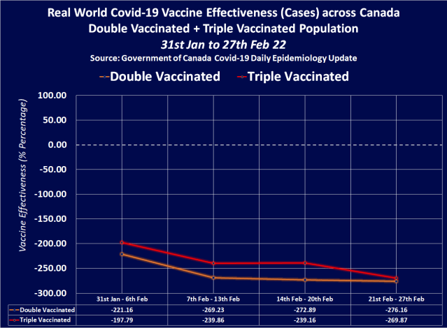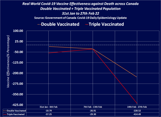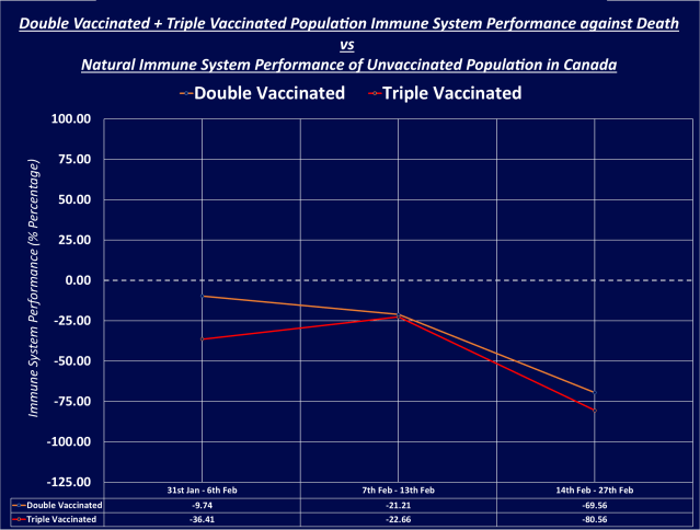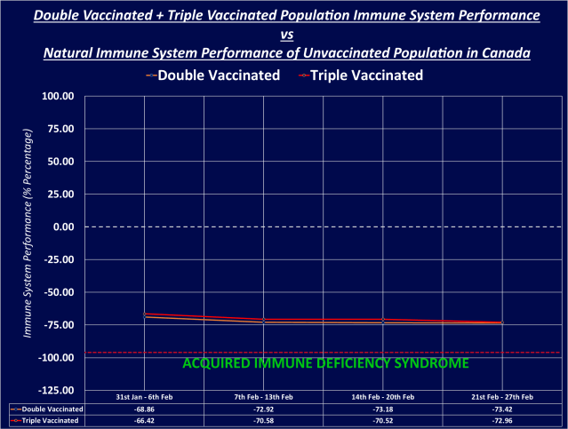 Double vaccinated individuals across Canada had an immune system performance of minus-69.56% by the 27th Feb 22, but triple vaccinated individuals across Canada had an immune system performance of minus-80.56%. This is what Covid-19 vaccination has done to the people of Canada.