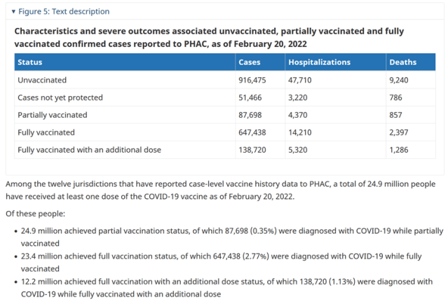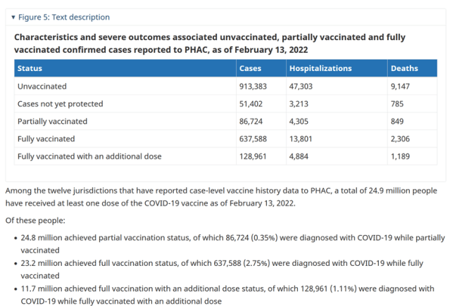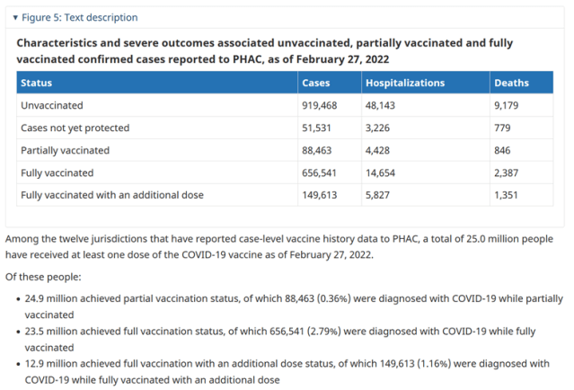 Page 20 onwards of the downloadable pdf contains data on Covid-19 cases, hospitalisations and deaths from the very start of the Covid-19 vaccination campaign in Canada on 14th Dec 20 all the way through to 27th Feb 22.