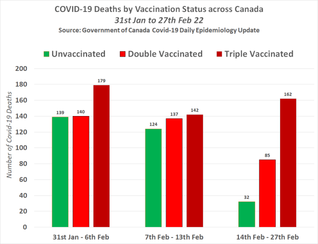 The following chart shows the total number of Covid-19 deaths per week by vaccination status across Canada between 31st Jan 22 and 27th Feb 22 –
