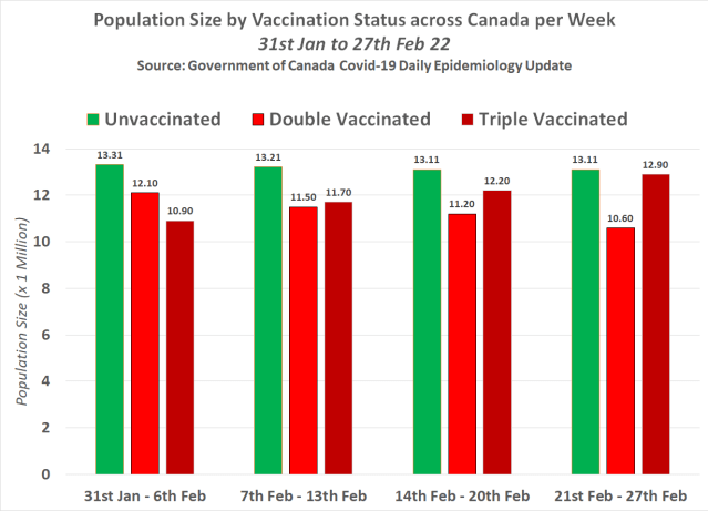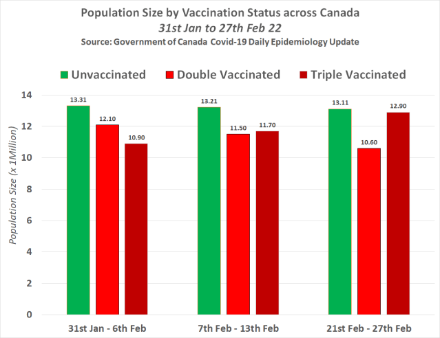 The following chart shows the population size by vaccination status across Canada between 31st Jan and 27th Feb 22 –