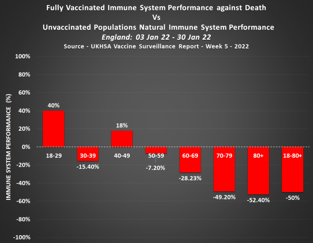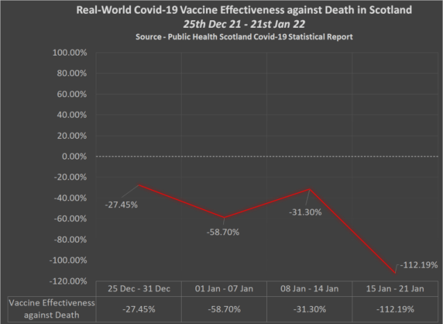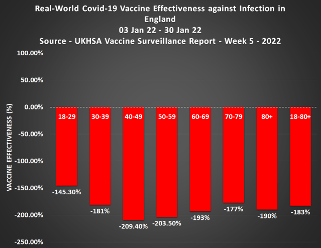 Real world Covid-19 vaccine effectiveness against death in England between 3rd Jan and 30th Jan 22 was as low as -110.24% in the over 80’s, -97% in people aged 70-79, and -98.14% on average in all adults over age 18.