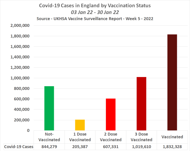 The following chart shows the total number of cases in England by vaccination status between 3rd Jan and 30th Jan 22 by vaccination status –