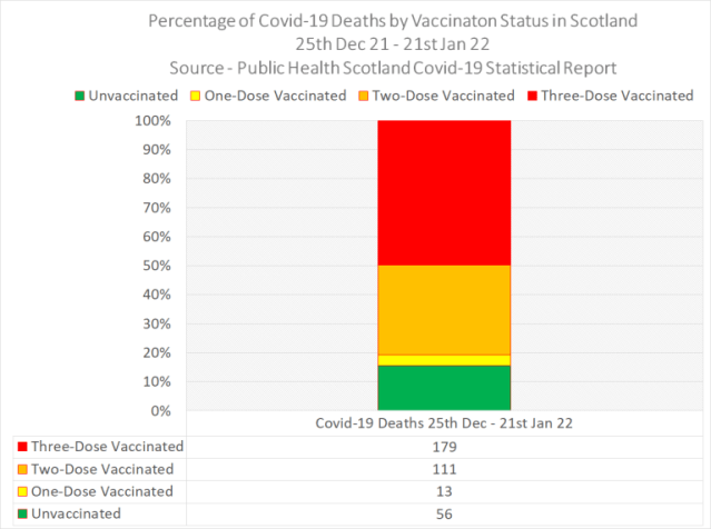 The following chart shows the percentage of Covid-19 deaths by vaccination status in Scotland between 25th Dec 21 and 21st Jan 22, according to the report they published Wednesday 2nd February –