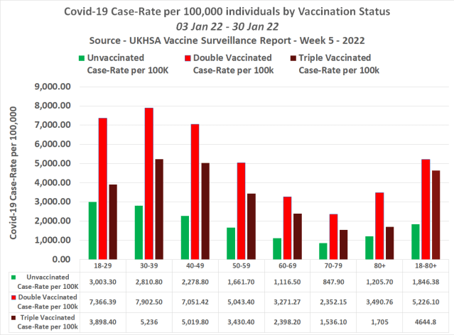 The UK Health Security Agency (UKHSA) kindly provide us with the case-rates per 100k population by vaccination status. However, their Week 2 – 2022 – Vaccine Surveillance Report was the last time they published the case-rates per 100k among the double vaccinated, instead choosing to only publish the case-rates per 100k among the triple vaccinated since.