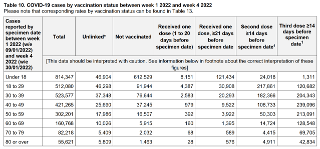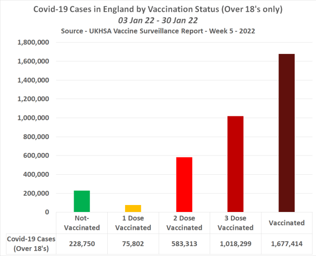 The following chart shows the total number of cases among people aged over 18 in England by vaccination status between 3rd Jan and 30th Jan 22 by vaccination status –