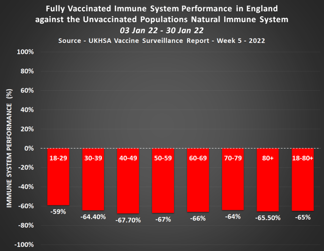 The fully vaccinated fare so badly against Covid-19 now because vaccine induced antibodies against the Alpha spike protein are next to useless against Omicron. So the underlying progressive immune system damage wrought by incessant spike protein production has almost nothing to hide behind, nothing to offset itself against.