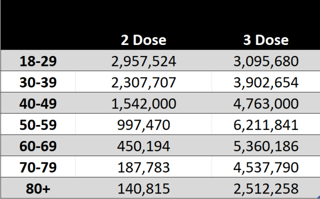 Next we need to calculate the population size of each age group in the triple vaccinated demographic in the Week 5 -2022 Vaccine Surveillance Report using the same method.