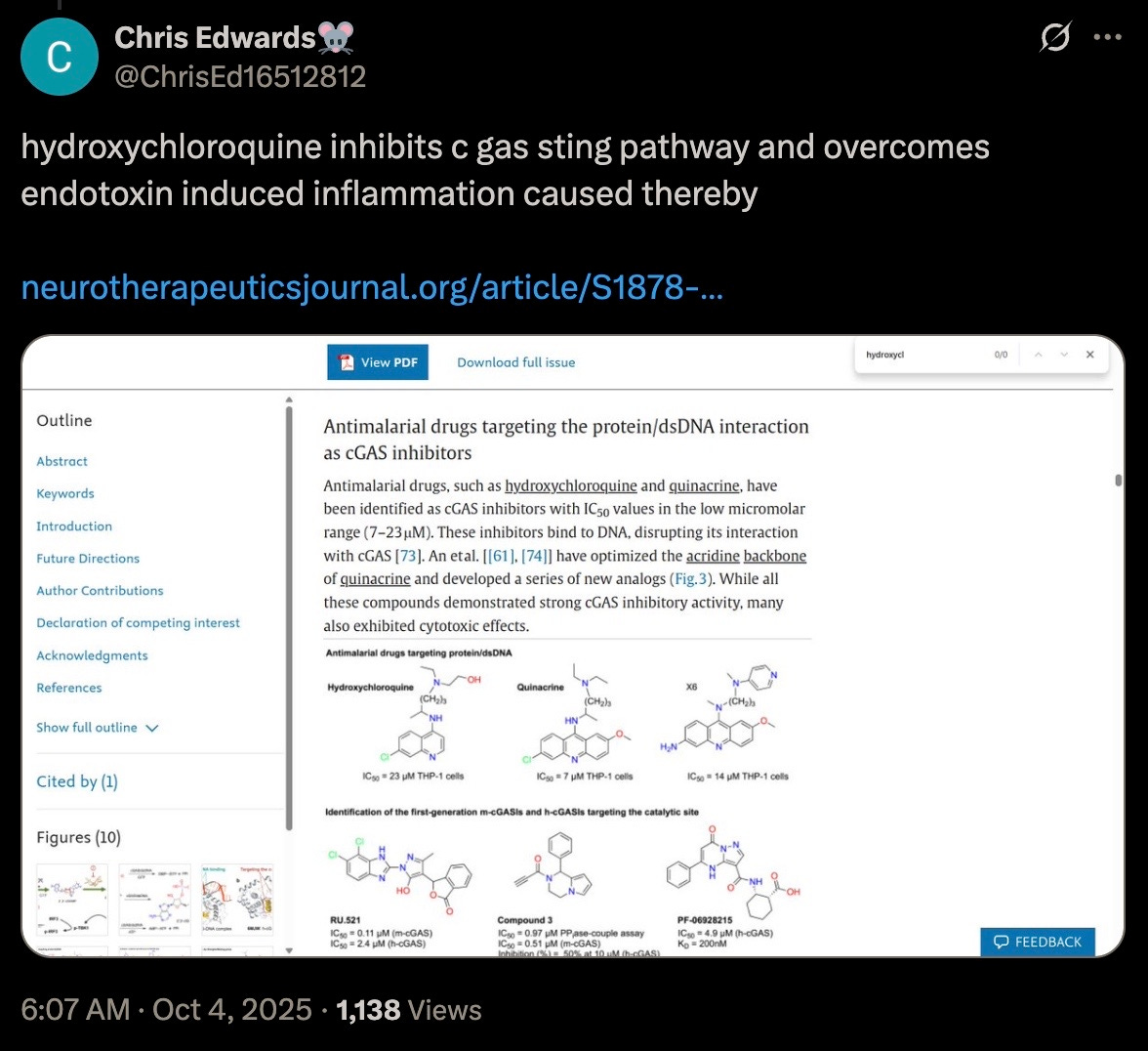 Hydroxychloroquine also treats Alzheimer’s disease (Identification and development of cGAS inhibitors and their uses to treat Alzheimer’s disease) by inhibiting cGAS with IC50 values: