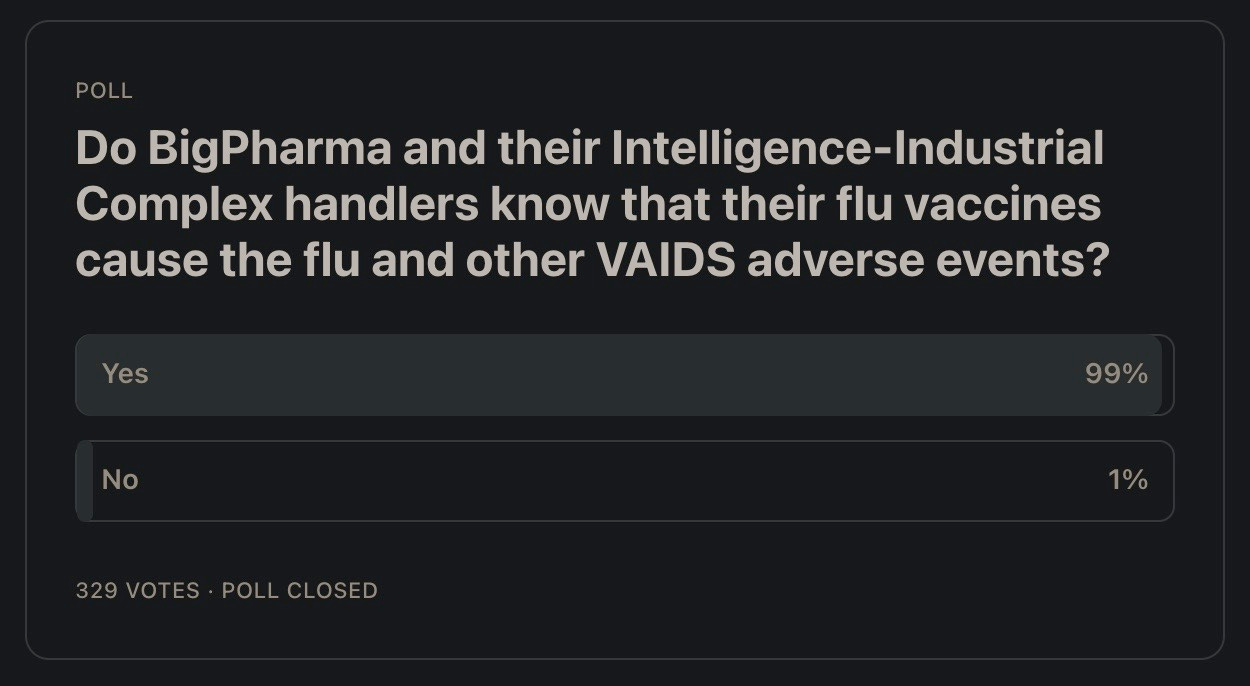 POLL RESULT: Do BigPharma and their Intelligence-Industrial Complex handlers know that their flu vaccines cause the flu and other VAIDS adverse events?