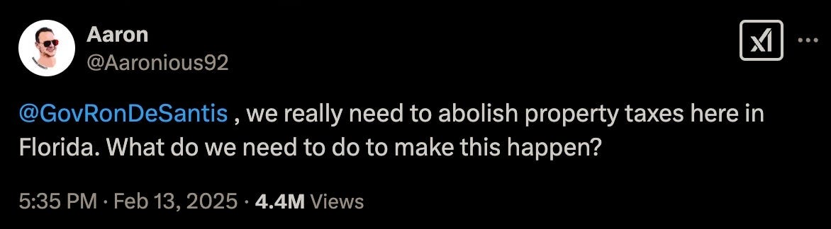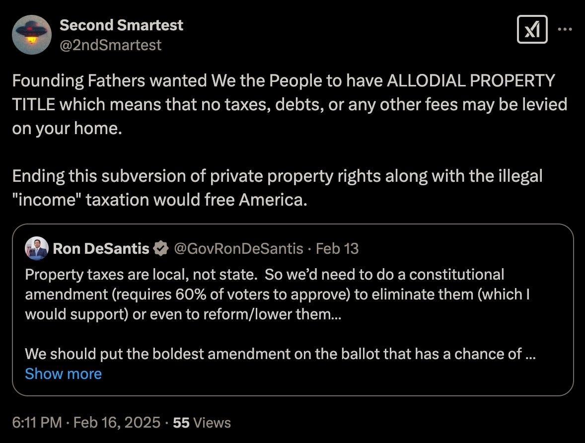 Governor DeSantis replied to this X post with a shockingly pleasant response, and yet not a single commenter invoked ALLODIAL PROPERTY TITLE, so yours truly quoted the exchange: