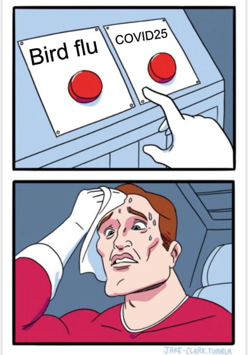 And the added bonus of course is that the possible uptake of PSYOP-BIRD-FLU “vaccines” would have been around zero; thus, a slightly deadlier virus could goose BigPharma profits since the current PSYOP-19 “vaccine” uptake (in 2025) is nearly nonexistent.