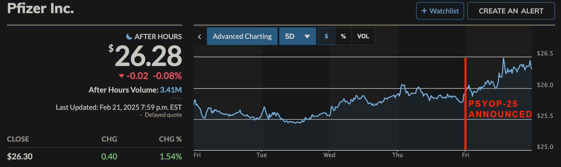 BigPharma profits have been plummeting, but since Friday’s PSYOP-25 announcement Pfizer’s stock has, pun intended, spiked: