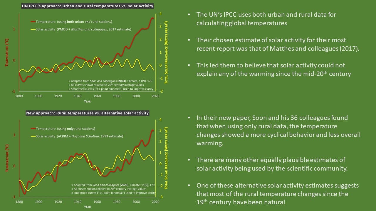 When the authors analysed the temperature data only using the IPCC’s solar dataset, they could not explain any of the warming since the mid-20th century. That is, they replicated the IPCC’s iconic finding that global warming is mostly human-caused. However, when the authors repeated the analysis using a different estimate of solar activity – one that is often used by the scientific community – they found that most of the warming and cooling trends of the rural data could actually be explained in terms of changing solar activity.