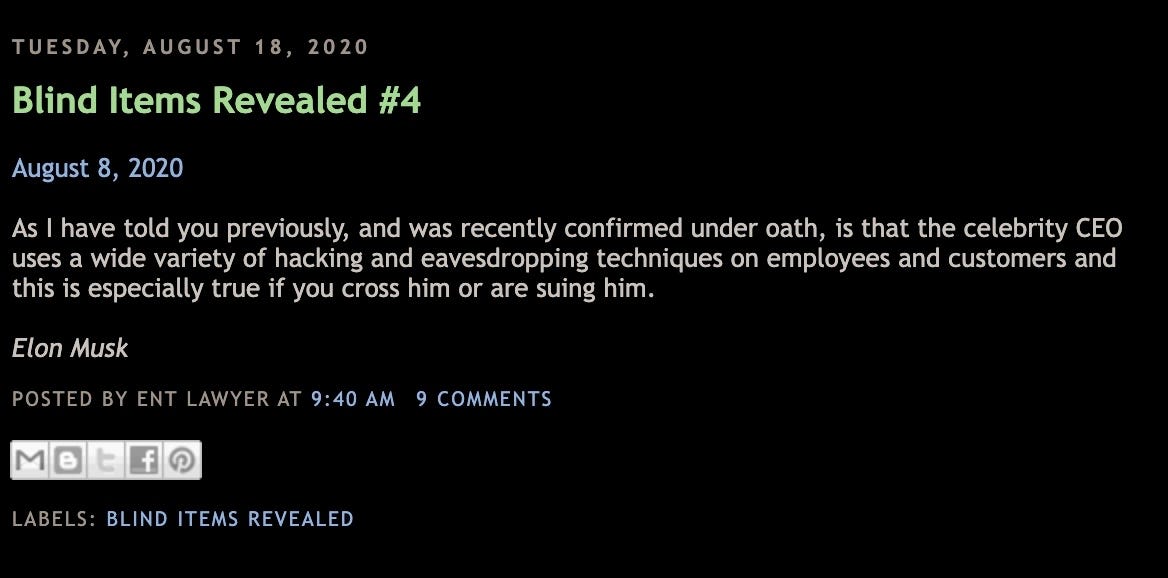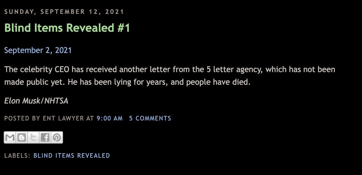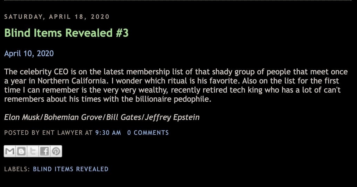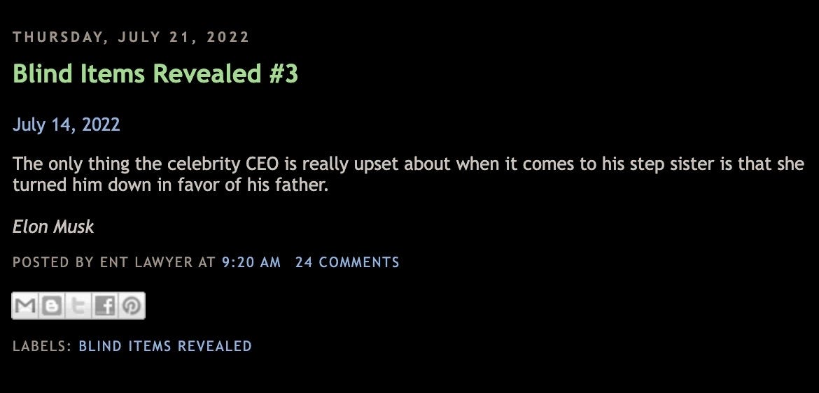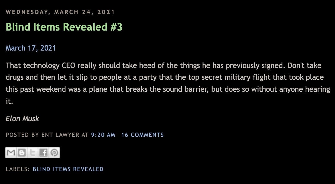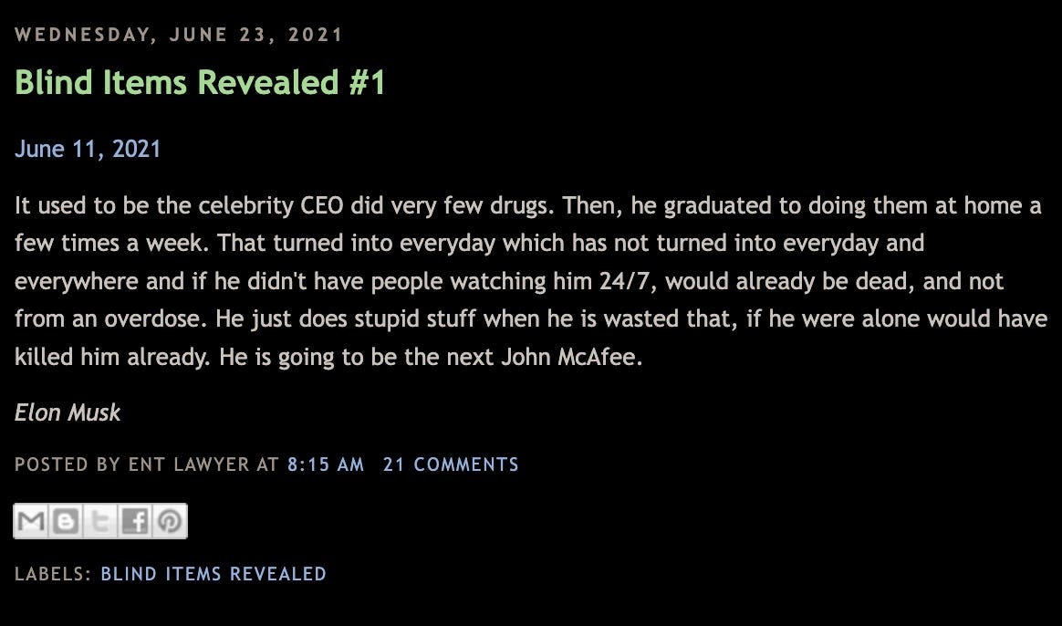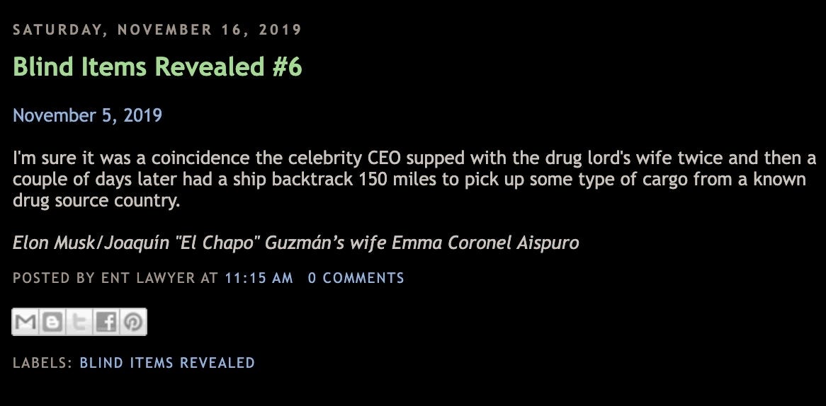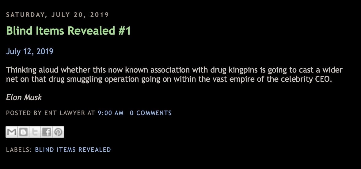 PS, an insider Hollywood lawyer that goes by the moniker enty runs a site called crazy days and crazy nights. His insider gossip track record is around 100% accurate. He has for several years now been exposing Musk as a drug running drug addict that is full of shit. Here are some examples of who Musk really is:
