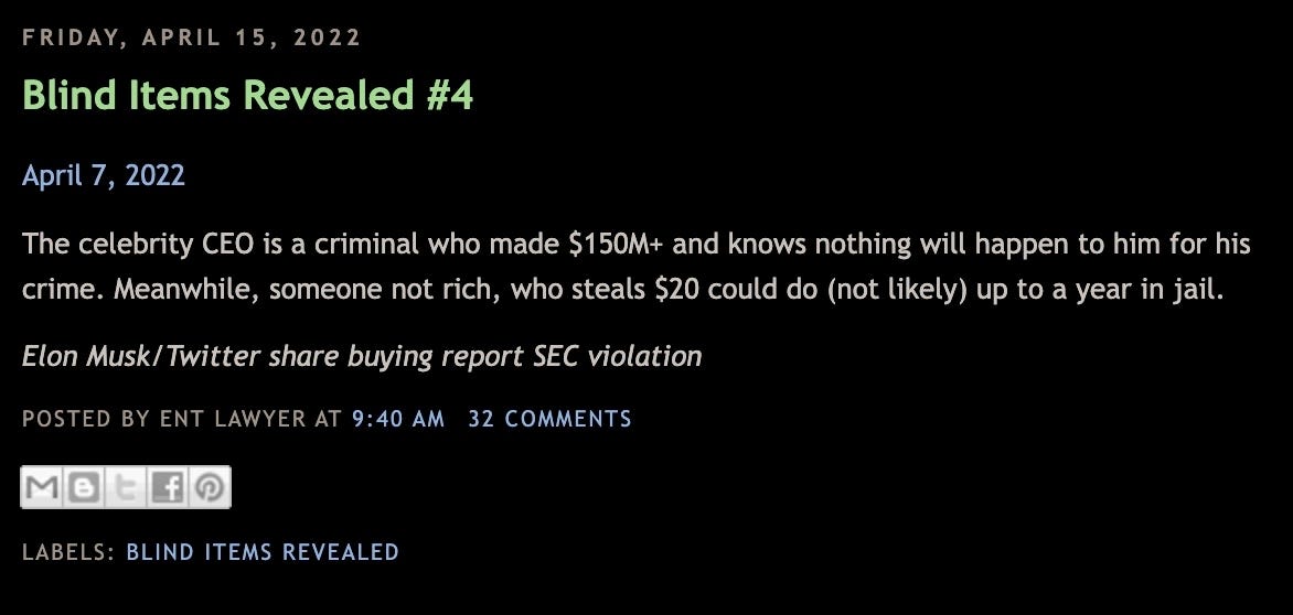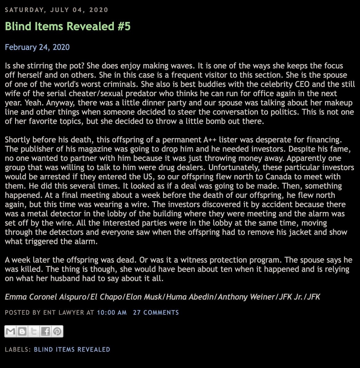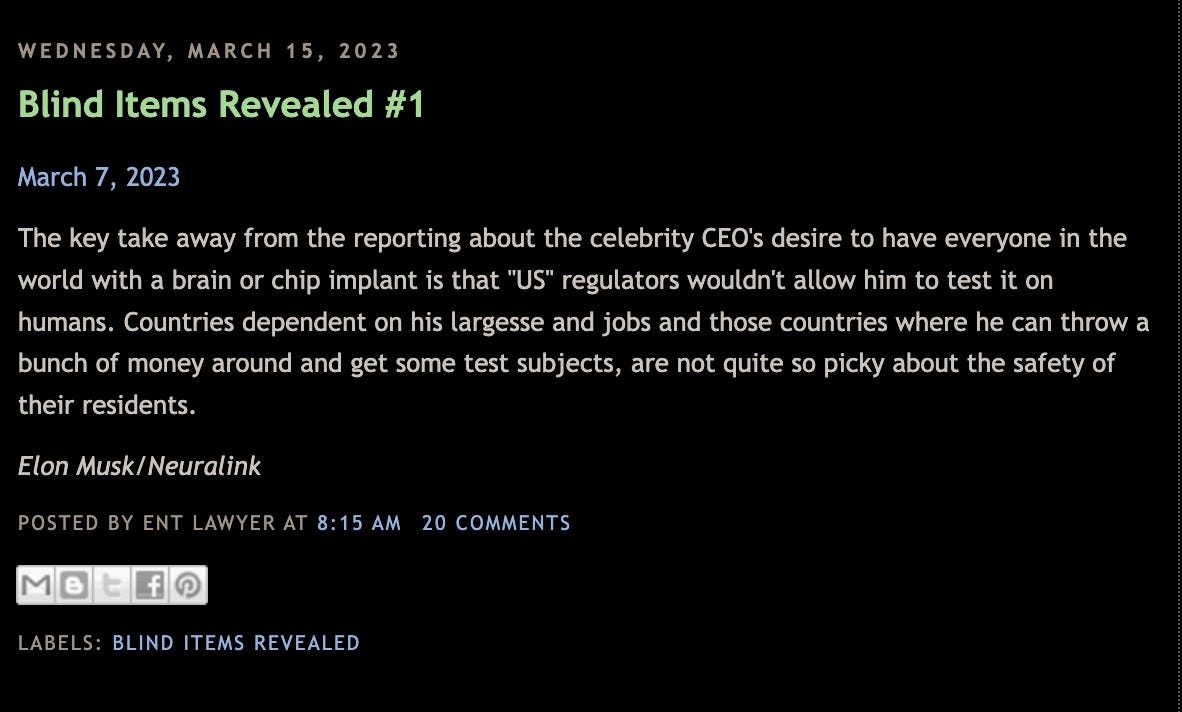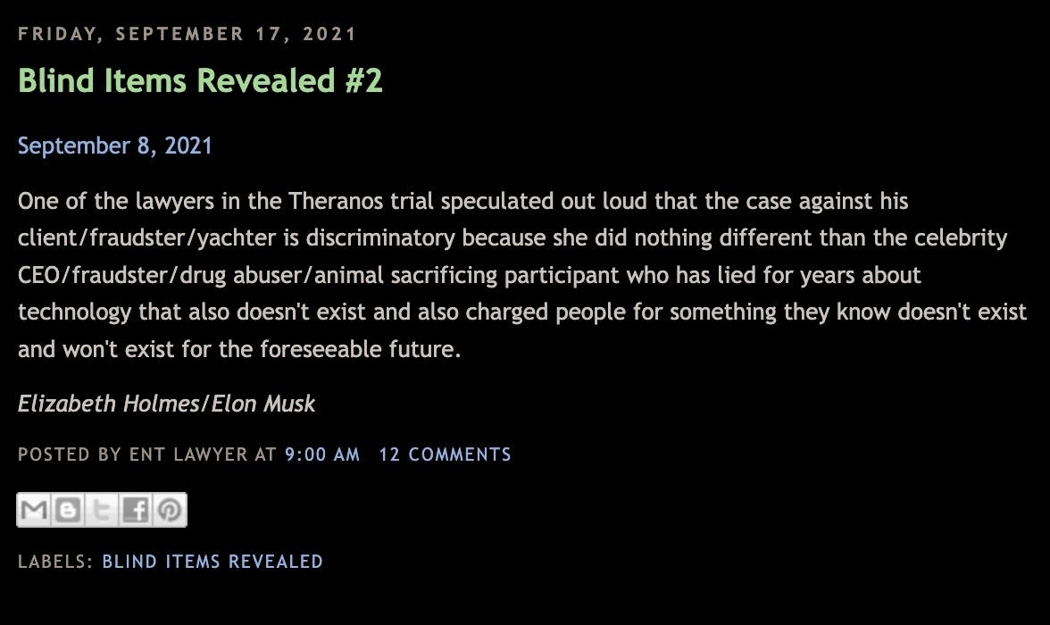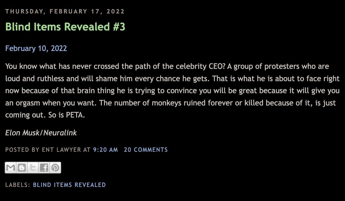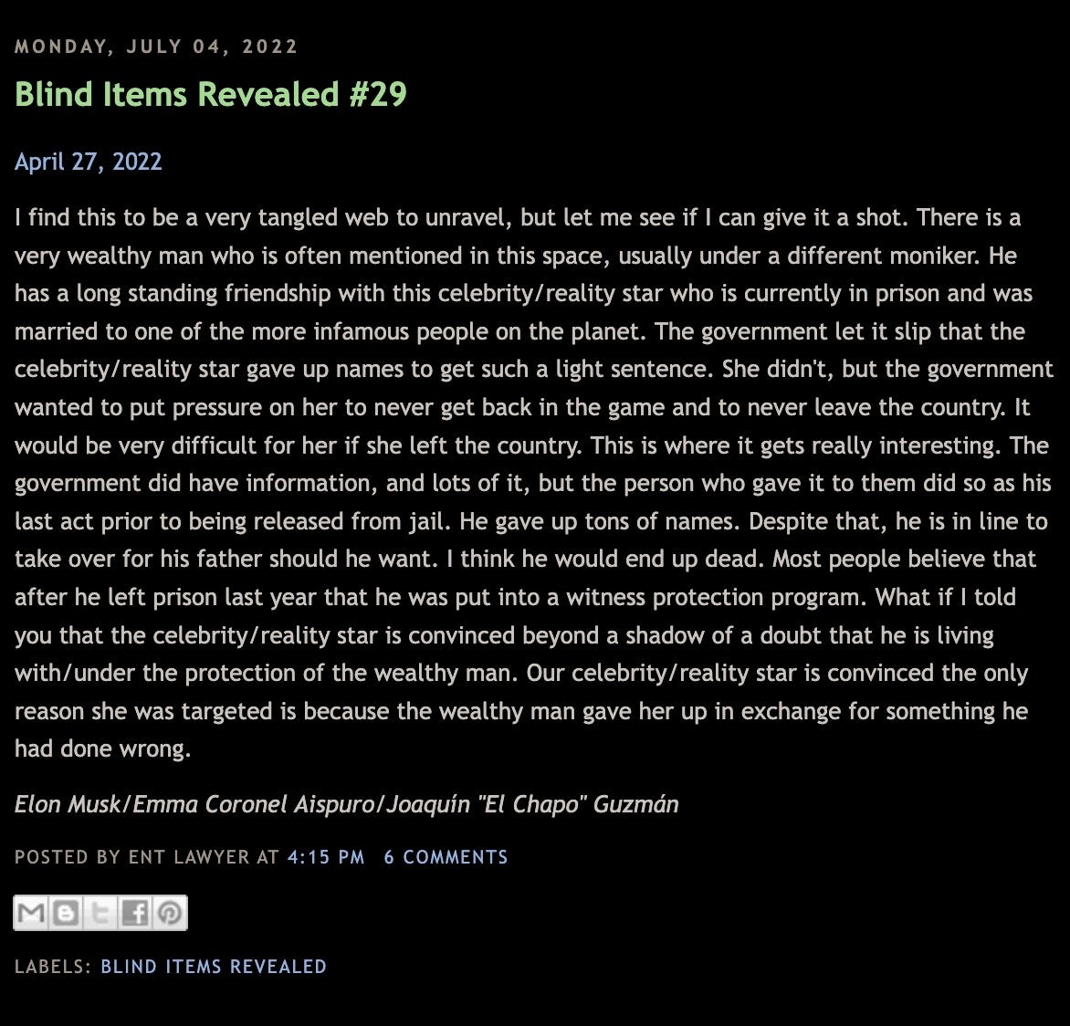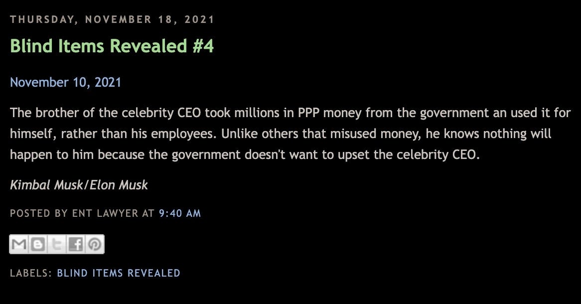 PS, an insider Hollywood lawyer that goes by the moniker enty runs a site called crazy days and crazy nights. His insider gossip track record is around 100% accurate. He has for several years now been exposing Musk as a drug running drug addict that is full of shit. Here are some examples of who Musk really is: