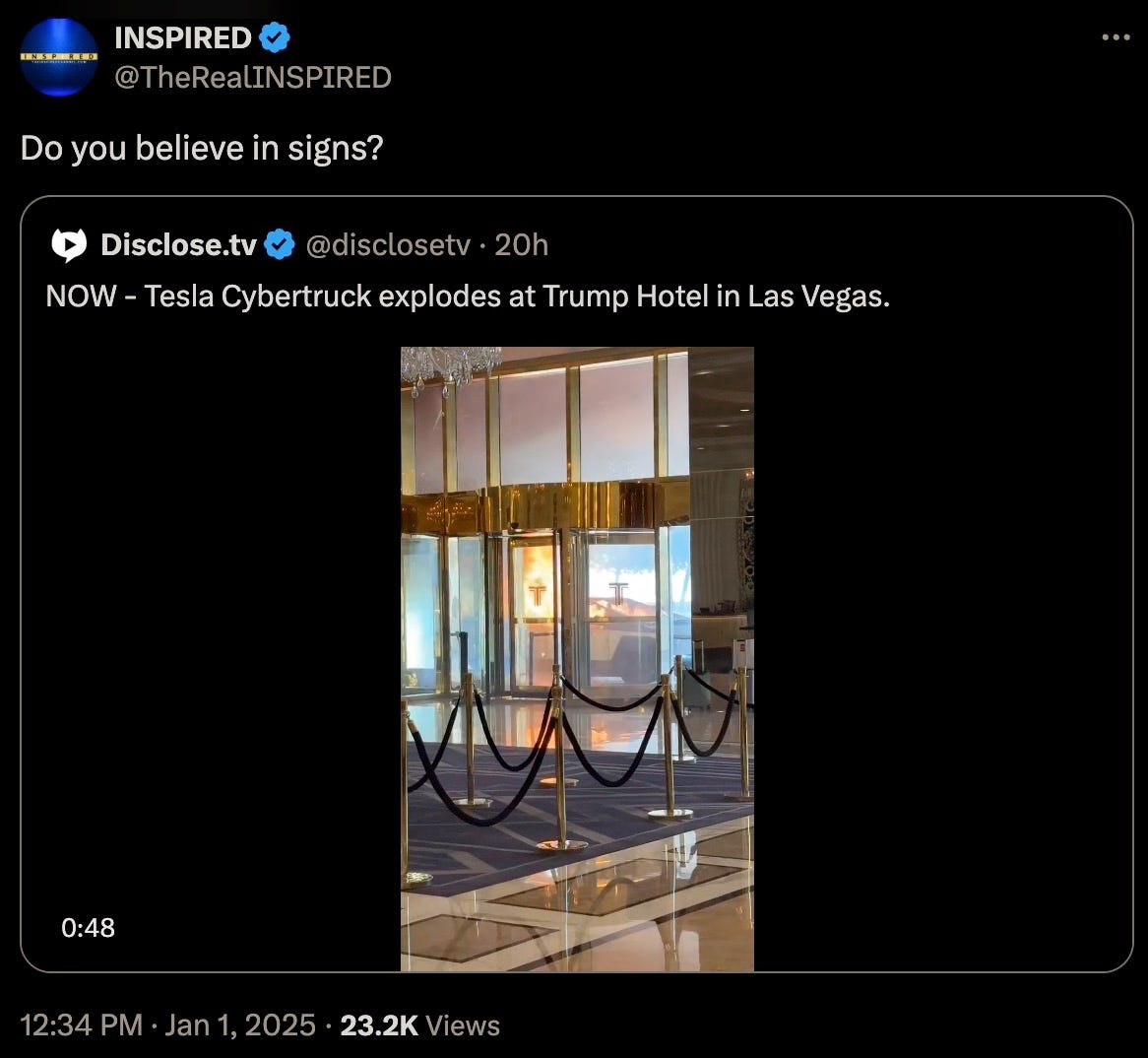 Concurrent to the New Orleans attack, another especially symbolic terror event was executed right in front of one of President Trump’s hotels, blowing up PSYOP-MUSK’s highly combustable Cybertruck: