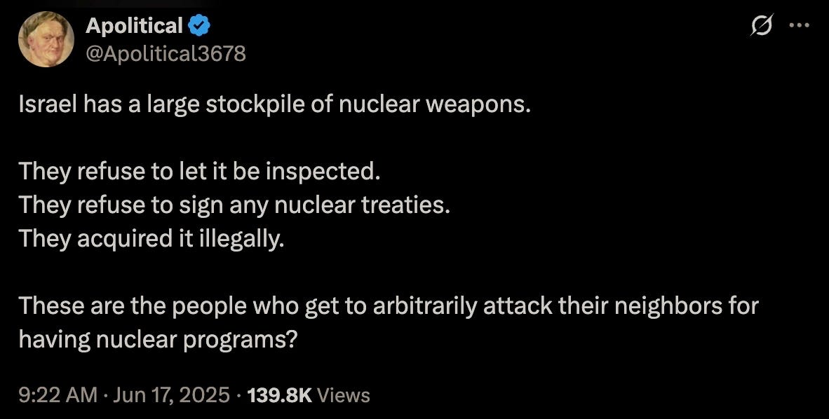 Just to reiterate, Israel has been claiming for over four decades now that Iran will imminently have a nuclear weapon, and yet it is Israel calling the kettle black: