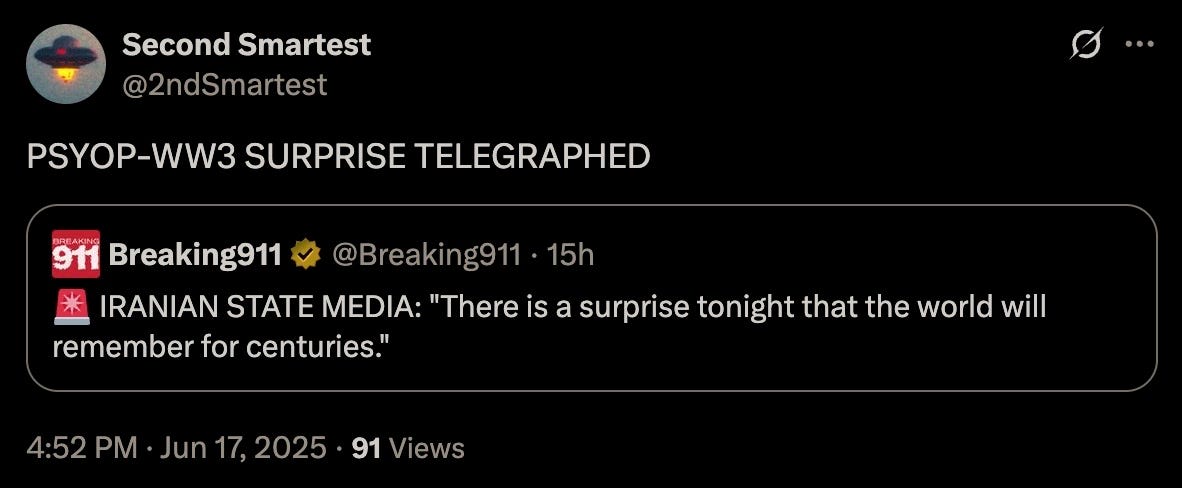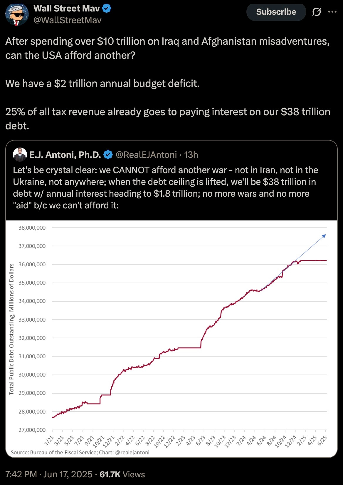 Two weeks ago, legendary financial and geopolitical cycle analyst Martin Armstrong was signaling a big turn toward war. We all know Ukraine is out of control with no peace deal in sight, and now the Middle East is blowing up too. Armstrong says, “I think Trump has been kind of snookered into this . . . Netanyahu knew he could not get the nuclear. Now, he says we are losing because they have not been able to achieve that. So, Netanyahu says President Trump, please go in and attack Iran and eliminate that, which is World War III. . .. Iran is not by itself. We have to consider what is going to take place here. . .. I am concerned this drags in Russia and also China. . .. You have Zelensky over there conspiring with Britain to use an old Soviet torpedo to sink an American ship so they can blame that on Russia. You have the same nonsense in the Middle East so they can create a false flag there to say Iran attacked American forces. They are trying to drag Trump into World War III. These neocons are horrible people. They have no humanity, and they do not care about how many people die.”