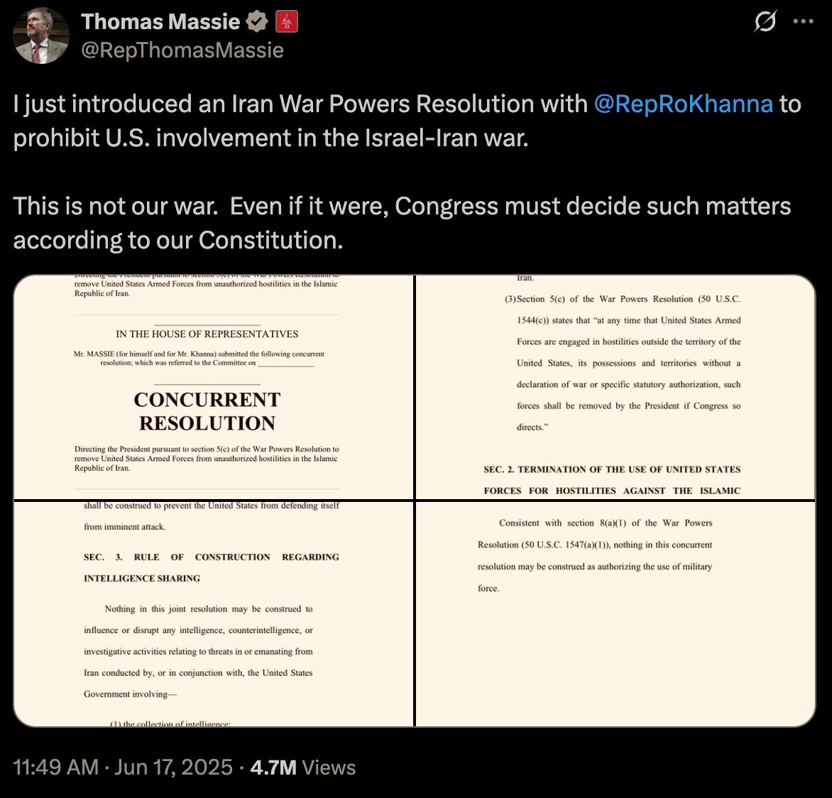 U.S. Representative Massie is perhaps the only member of congress that is not owned by Israel and AIPAC (American lobbying group advocating for pro-Israel policies); in fact, AIPAC has for years been actively working to remove Massie from congress because he refused their bribes, and as such would not promote an Israel (war) agenda. This makes AIPAC a legitimately criminal lobbying group.