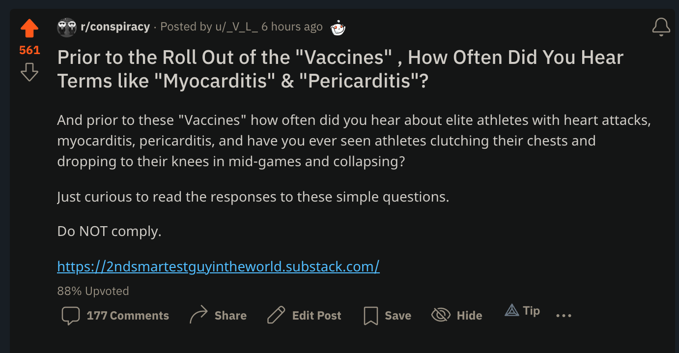A few hours ago I posted here Prior to the Roll Out of the "Vaccines", How Often Did You Hear Terms like "Myocarditis" & "Pericarditis"? and simultaneously posted in Reddit’s conspiracy sub. Note the percentage up to down vote and the number of comments — this post will continue to rack up upvotes: