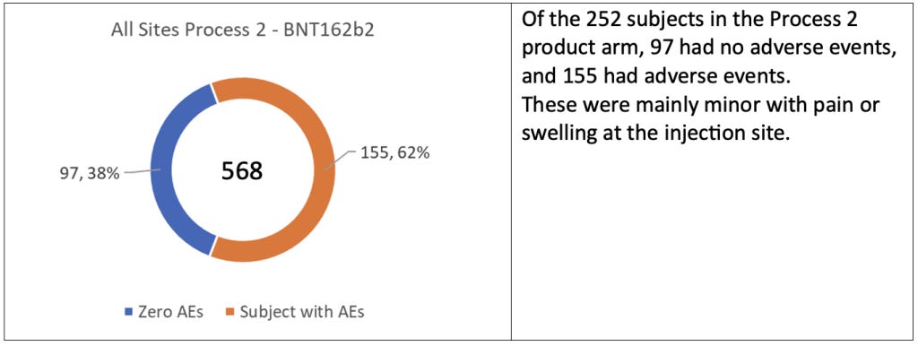 There was a significant difference in the number of adverse events in the Process 2 group of test subjects, which should have rung alarm bells in the regulator’s heads as it was so much worse than the significant adverse events (AEs) found in the majority of the clinical trials.