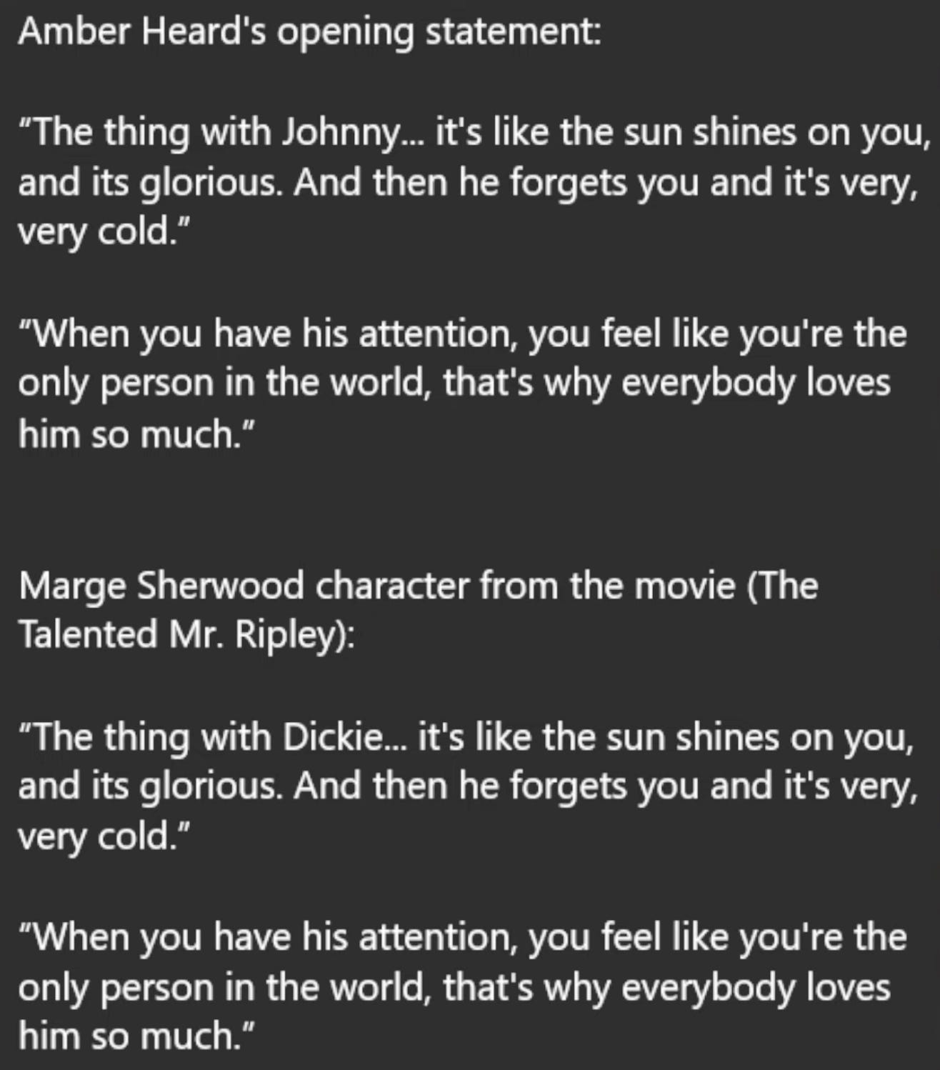 But yesterday we were treated to the especially deranged part of testimony that the MSM will dare not touch: Miss Heard in her opening statement plagiarized verbatim from the movie The Talented Mister Ripley; to wit: