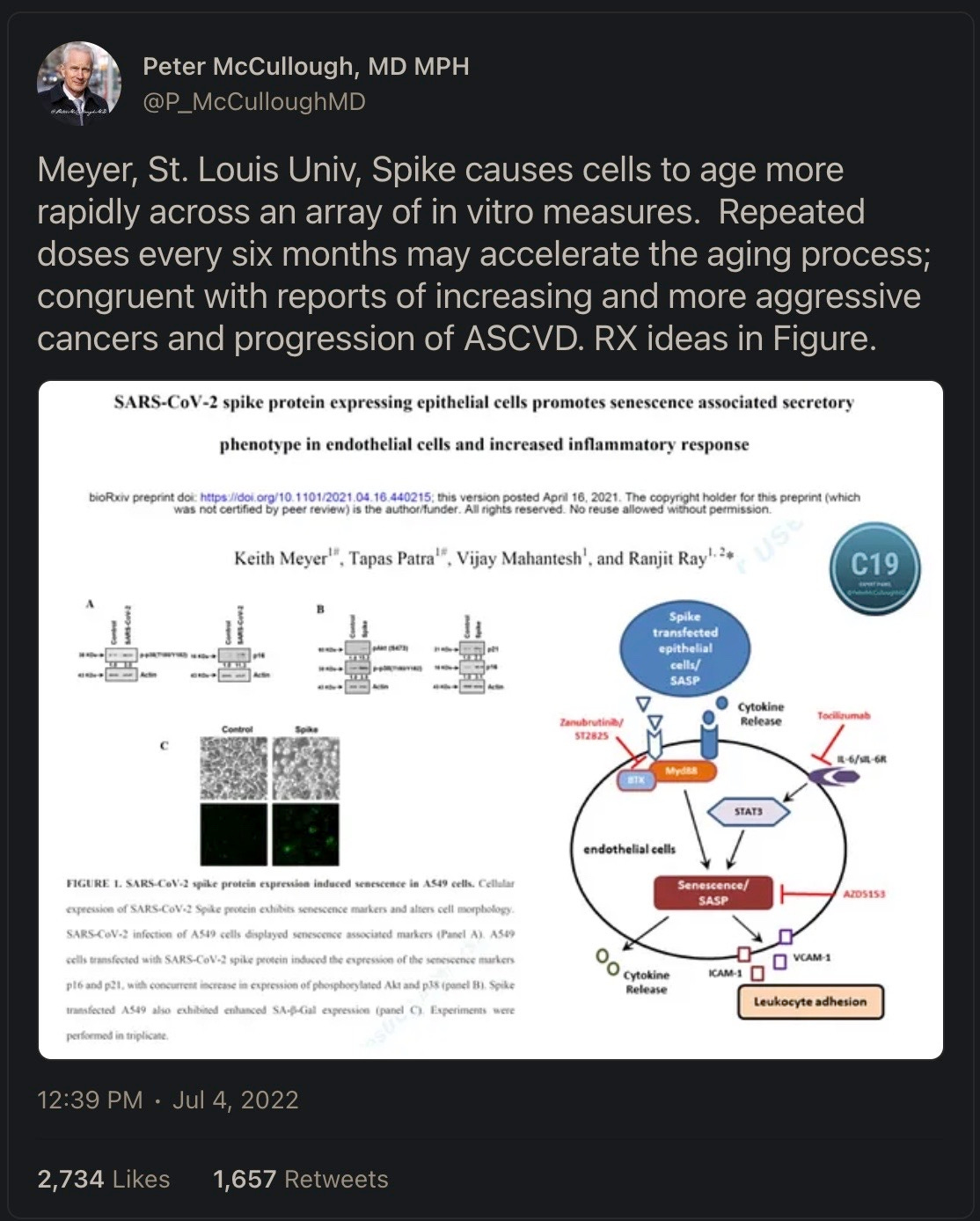 And if that were not enough, there is now evidence that the Spike Protein causes Accelerating Cell Aging ( acronym du jour: ACA) for Rapid Aging Process (and another acronym du jour: RAP), which essentially gibes with this substack’s thesis that lifespans are greatly shortened by all of those subjecting themselves to indefinite endogenous Spike Protein increases via the deadly injections; to wit: