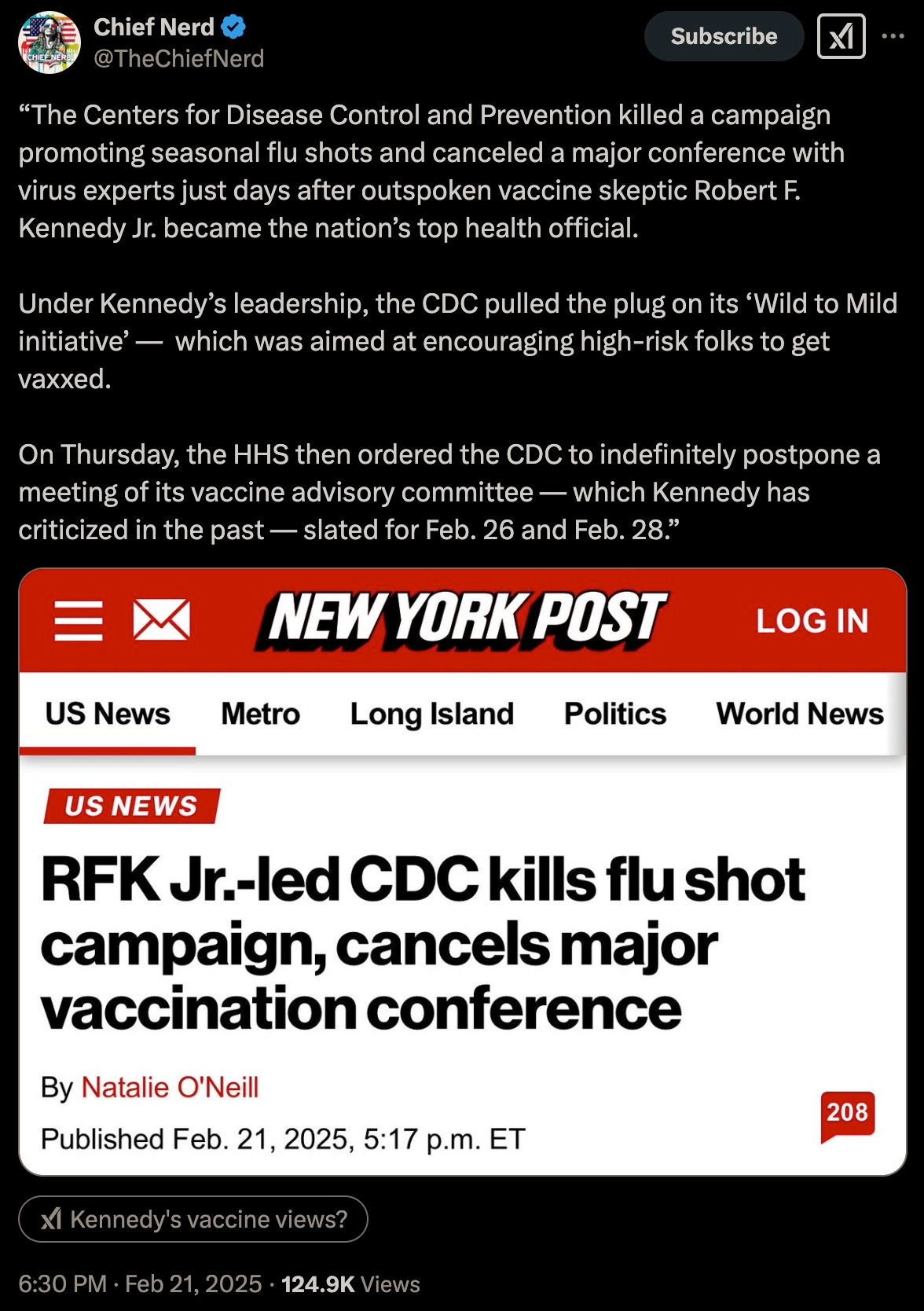On Thursday, the HHS then ordered the CDC to indefinitely postpone a meeting of its vaccine advisory committee — which Kennedy has criticized in the past — slated for Feb. 26 and Feb. 28, The Washington Post reported.