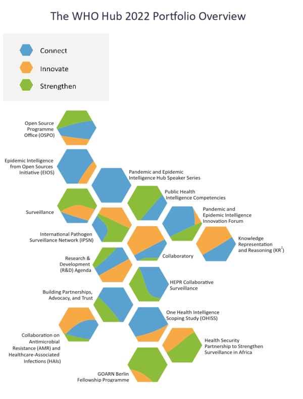 With support from the Government of the Federal Republic of Germany, the WHO Pandemic Hub for Pandemic and Epidemic Intelligence was established in September 2021. It has a presence in more than 150 countries and six regional offices with its headquarters in Geneva. It is a data and surveillance network which facilitates a global collaboration of partners to prepare, detect and respond to pandemic and epidemic risks. It will also develop tools and predictive models for risk analysis, and to monitor disease control measures and infodemics.