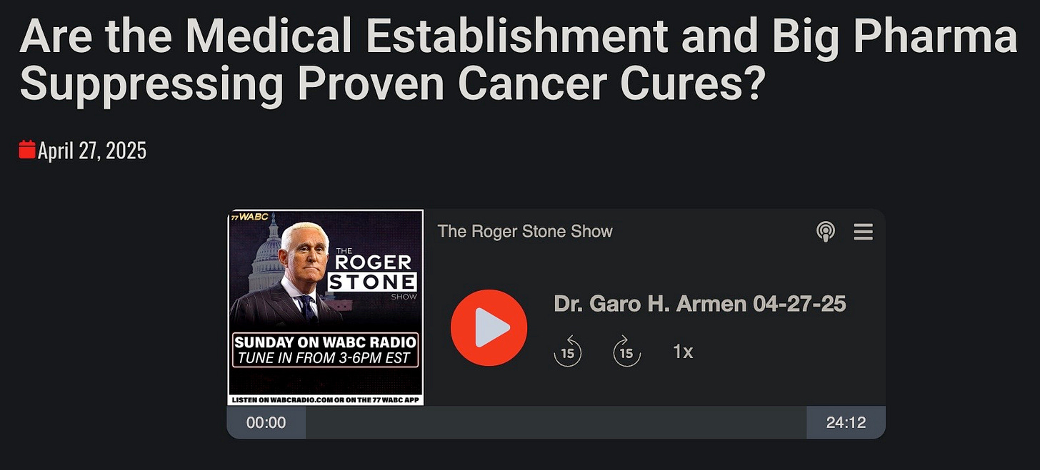 On a recent Stone Zone podcast Roger spoke with Dr. Garo Armen about how his wife survived her late stage cancer:
