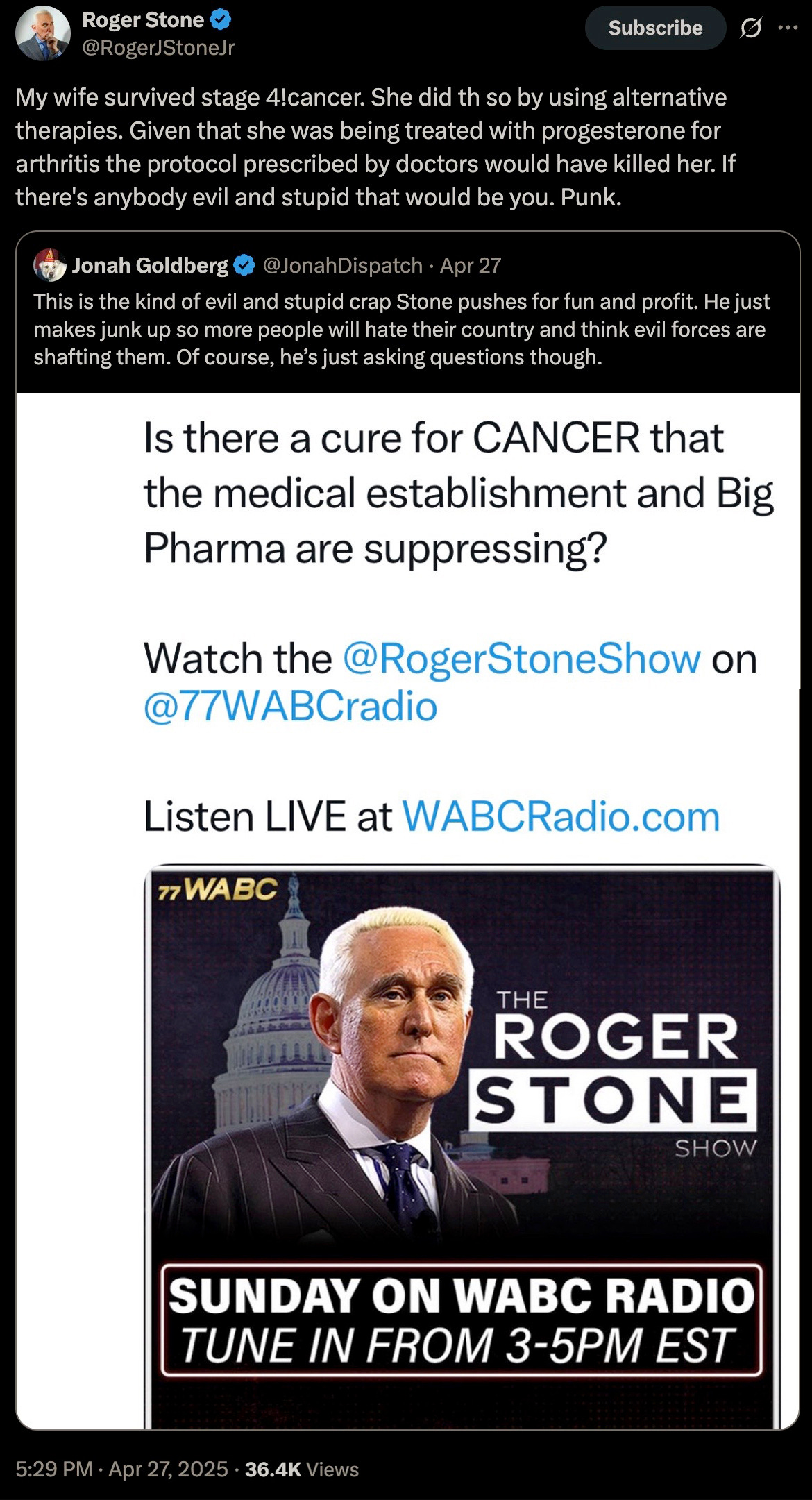 I'm merely telling you the experience that my wife and I have had personally, but also the testimony of literally thousands of people who contacted us when I went on radio and talked about my wife's situation. The number of people who contacted me through email, through text messages, people would just write, Roger Stone, the name of the city I live in, and the zip code. And it would reach me, all of them telling me positive stories about Fenbendazole, which is actually a drug that began, I believe, as a dog dewormer, just as Ivermectin was a horse dewormer. And all of those thousands of people cannot possibly be lying, nor can they be wrong.