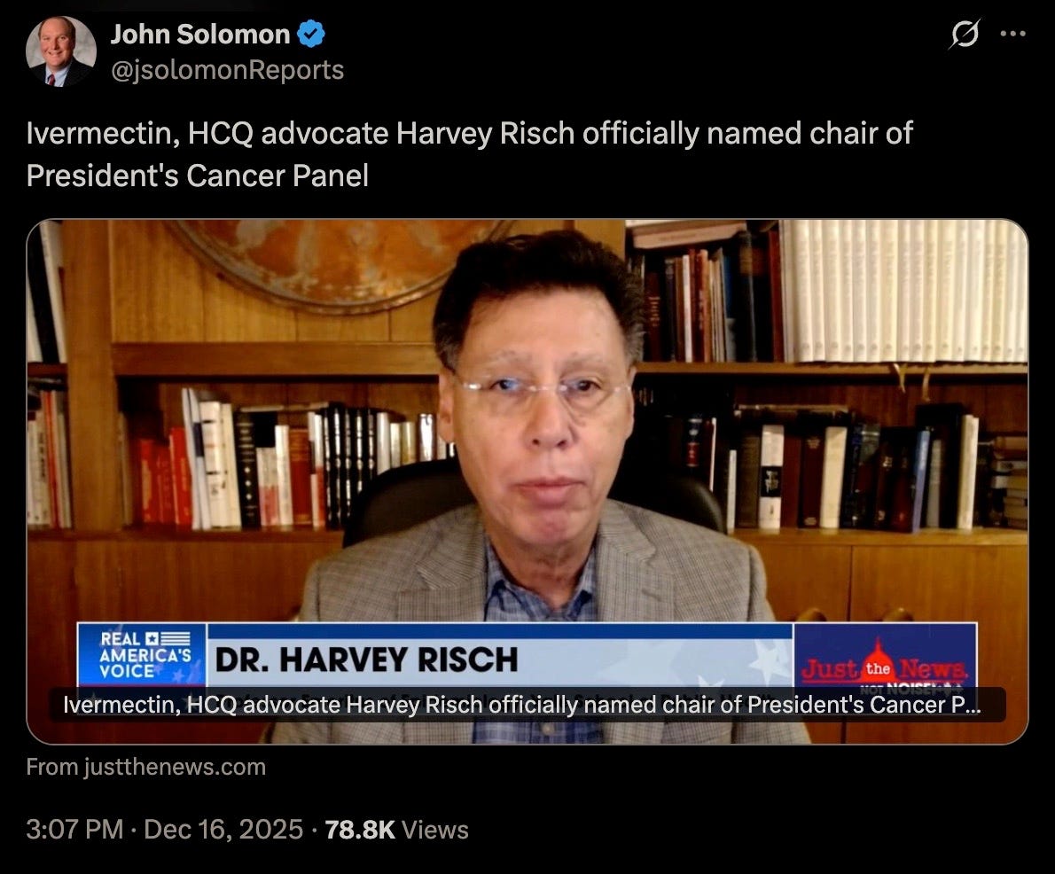 Dr. Risch also knows about this Substack’s cancer cure protocol, which is why he was just named chair of President Trump’s Cancer Panel — this is a tremendous MAHA development, and could very well be the start to curing not just cancer, but many of the other ‘incurable’ diseases with inexpensive repurposed drugs, which, unlike, say, chemotherapy, have no negative side effects whatsoever and actually work.