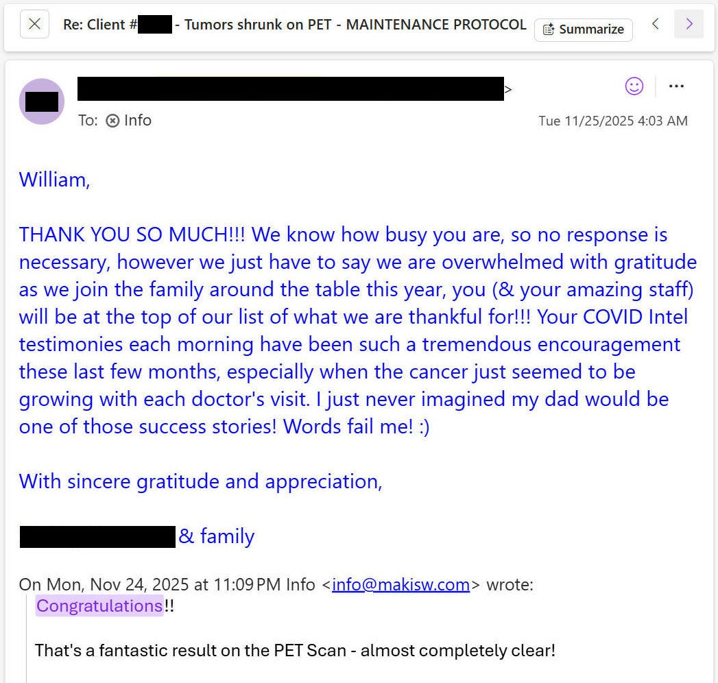 “Thank you so much!!! Your COVID Intel testimonies each morning have been such a tremendous encouragement these last few months...I just never imagined my dad would be one of those success stories! Words fail me! :)”