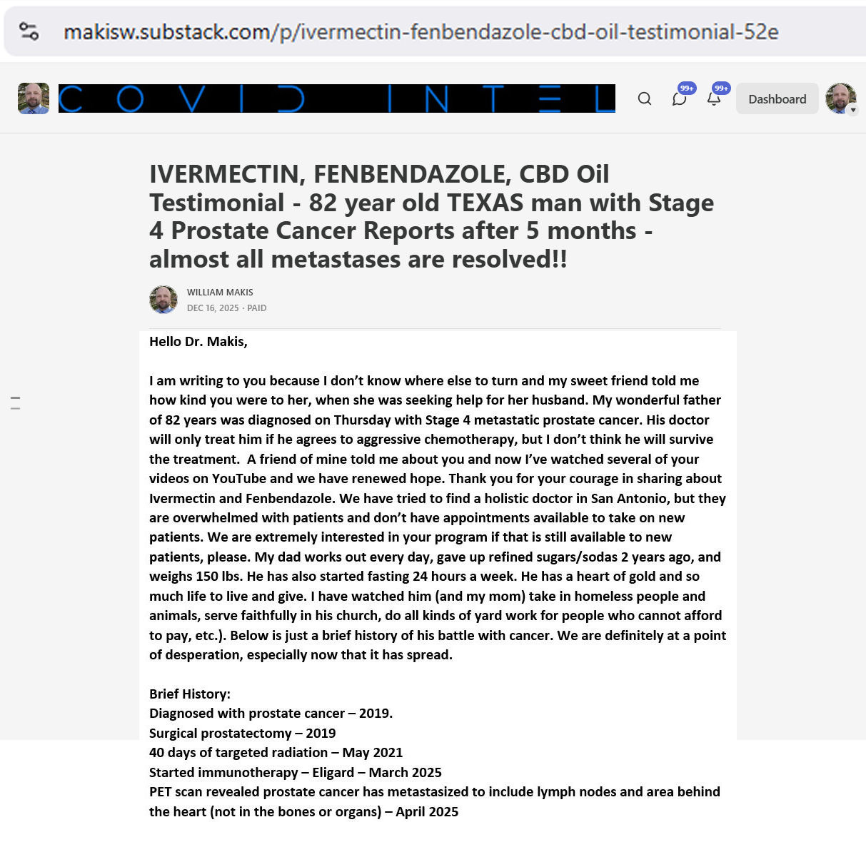 NEW ARTICLE: IVERMECTIN, FENBENDAZOLE, CBD Oil Testimonial - 82 year old TEXAS man with Stage 4 Prostate Cancer Reports after 5 months - almost all metastases are resolved!!