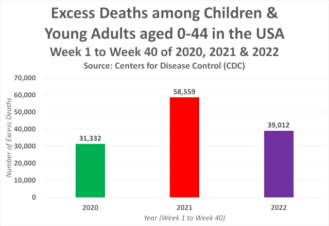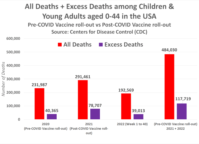 The average life expectancy in the USA as of 2020 was 77.28 years. If we are to believe the official narrative that Covid-19 is a deadly disease then we could perhaps agree that 231,987 children and young adults up to the age of 44 dying in 2020 resulting in 40,365 excess deaths was an unfortunate consequence of this disease.