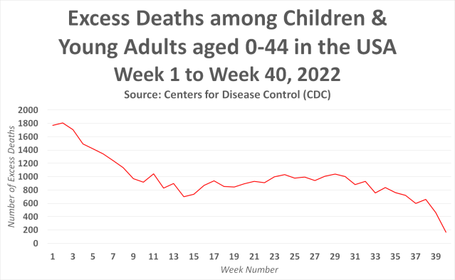 But the most concerning figures revealed in the above chart are the overall number of deaths an excess deaths among children and young adults since the roll-out of the Covid-19 injections.