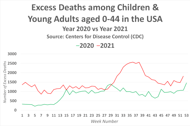 But the year 2021 was by and large the worst year for deaths among 0 to 44-year-olds, with 291,461 excess deaths in total, nearly 60,000 more than occurred in 2020. And according to the official CDC figures, this was mainly due to a mysterious sudden rise in deaths among children and young adults from around week 31 onwards.