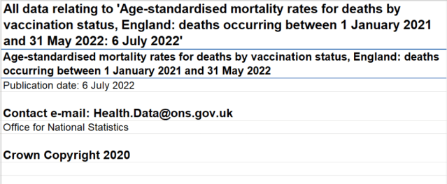 One of the pieces of evidence confirming this is a report published on the 6th of July 2022, by the UK’s Office for National Statistics, which is a UK Government agency.The report is titled ‘Deaths by Vaccination Status, England, 1 January 2021 to 31 May 2022‘, and it can be accessed on the ONS site here, and downloaded here.