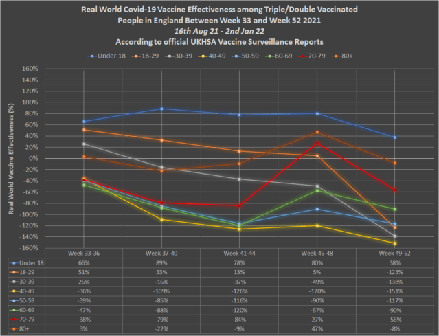 The first booster shots were administered in week 37 of 2021, and this graph illustrates clearly how they provided a boost in vaccine effectiveness in the following two months. But unfortunately, it also shows how short-lived this boost was with the effectiveness of the Covid-19 vaccines falling to frightening levels between weeks 49 and 52.