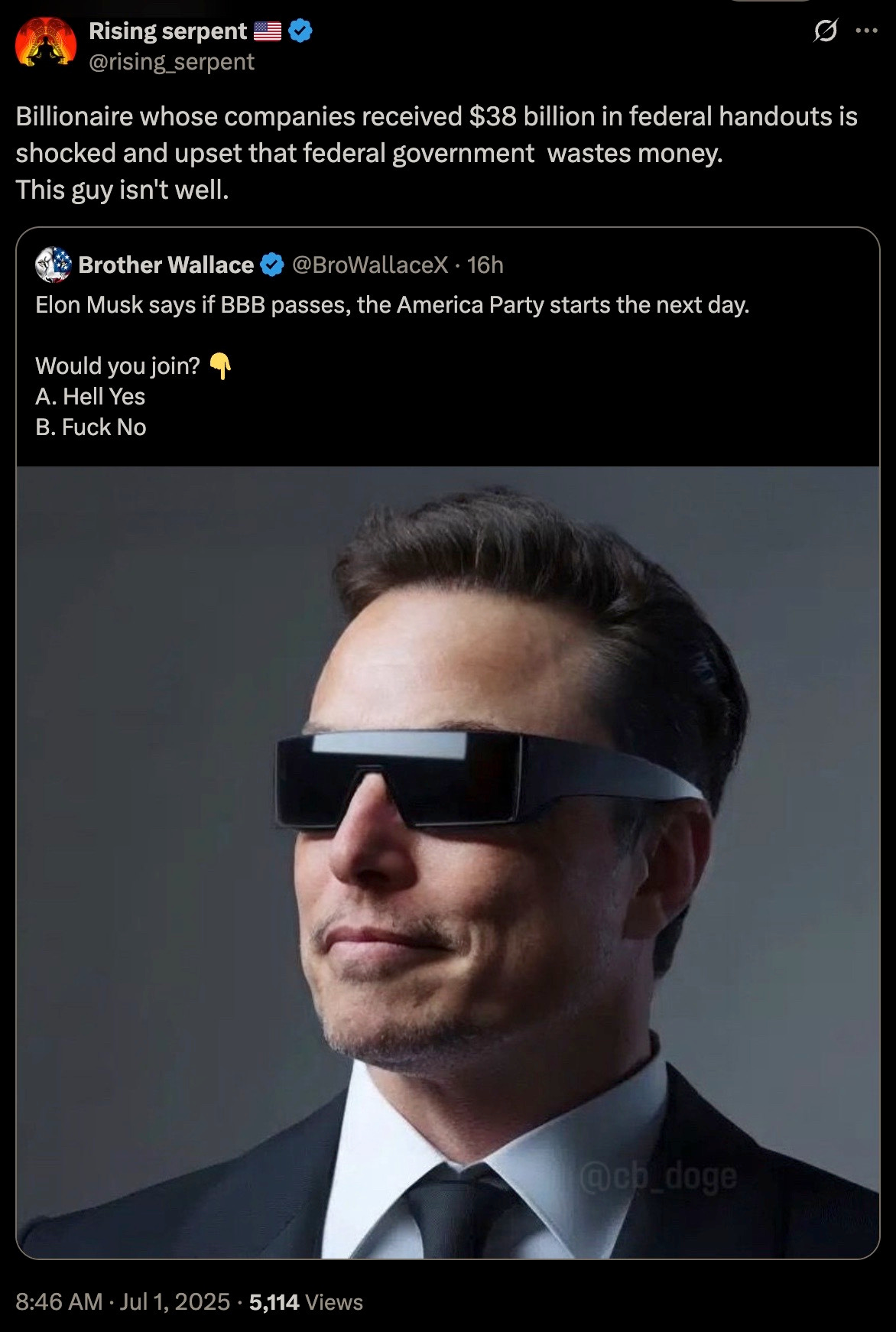 President Trump is absolutely correct in stopping this theft via “income” taxation to subsidize the likes of PSYOP-MUSK.