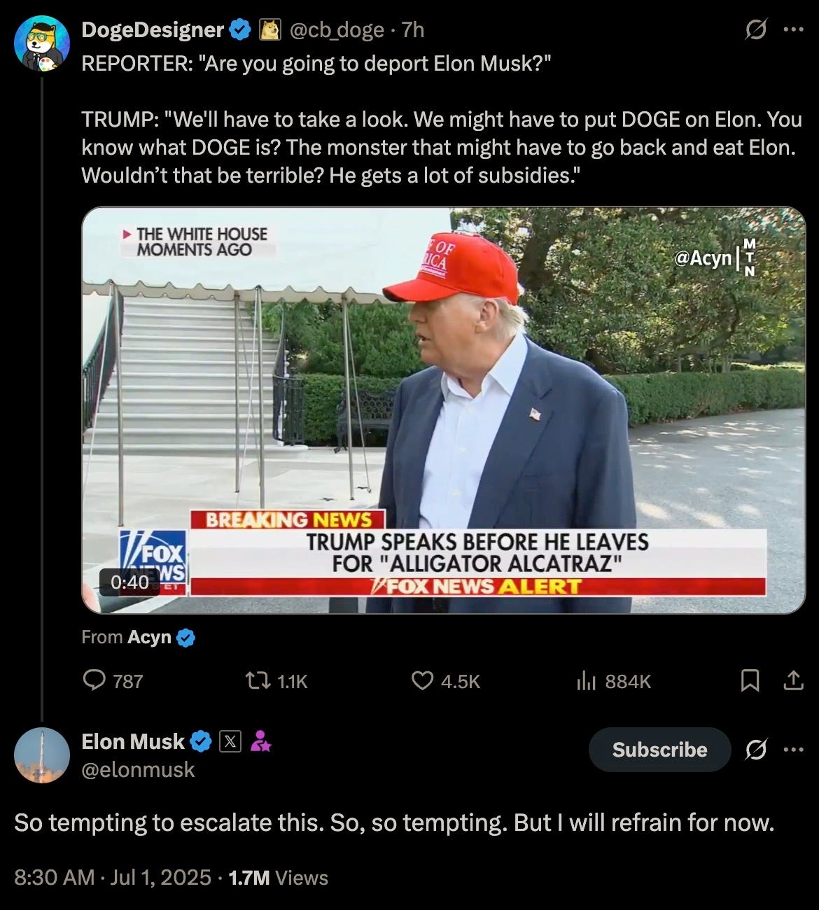 Trump: I don’t know. We’ll have to take a look. We might have to put DOGE on Elon. You know? You know what DOGE is? DOGE is the monster that might have to go back and eat Elon; wouldn’t that be terrible?