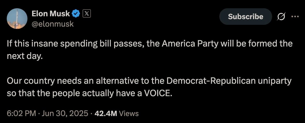 Just like every good psyop requires the disinformation to be sprinkled in with the truth (think: Qanon), we have PSYOP-MUSK’s Intelligence-Industrial Complex handlers feeding him very clever messaging by calling out their very own Uniparty all while dividing and conquering a rapidly splintering MAGA movement: