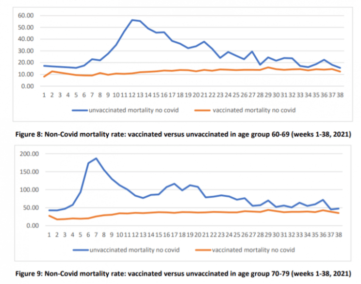 For the period of calendar weeks 1-38, 2021, Figures 8 and 9 show strong peaks in non-Covid mortality for the unvaccinated 60-69 and 70-79 age groups while the mortality among the vaccinated stayed steady.