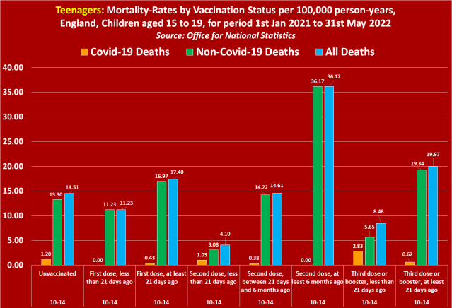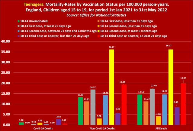 The worst figures in terms of all-cause deaths are however among double-vaccinated teenagers. Official UK Government data reveals that double vaccinated teenagers, with a mortality rate of 36.17 per 100,000 person-years, are 149.3% / 2.5 x more likely to die of any cause than unvaccinated teenagers with a mortality rate of 14.51 per 100,000 person-years.