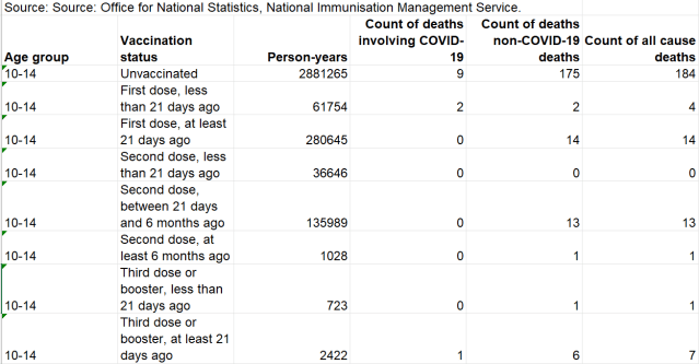 Here’s a snapshot of the ONS data on deaths among children aged 10 to 14 between 1st Jan 2021 and 31st May 2022 by vaccination status –