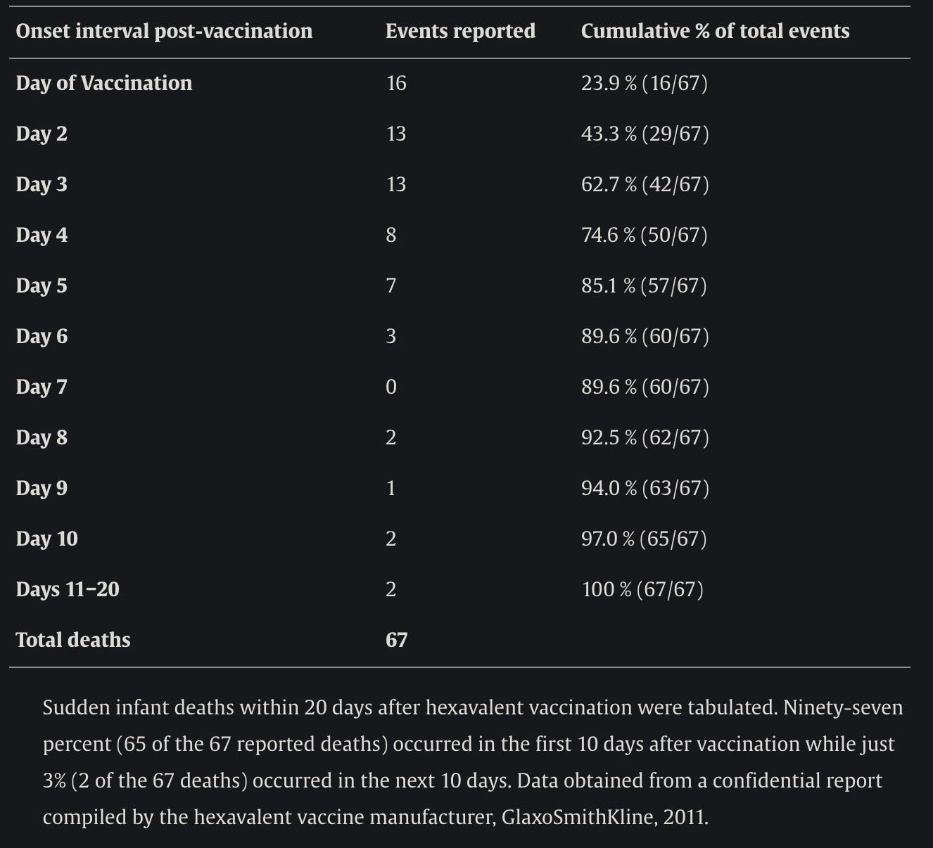 In 2011, a European hexavalent vaccine manufacturer, GlaxoSmithKline (GSK) [56], produced a confidential report on SIDS. (The report was made publicly available by the Italian Court.) Sudden deaths that occurred within 20 days after hexavalent vaccination were tabulated. The manufacturer concluded that the number of sudden deaths reported after receipt of its hexavalent vaccine did not exceed the background incidence or expected number of cases. However, despite the manufacturer's conclusion that its hexavalent vaccine does not increase the risk of sudden death, Table 36 on page 249 of the confidential report shows that 62.7 % of these deaths clustered within 3 days post-vaccination and 89.6 % occurred within 7 days post-vaccination. Perhaps more significantly, 97 % (65 of the 67 reported infant deaths) occurred in the first 10 days post-vaccination while just 3% (2 of the 67 infant deaths) occurred in the next 10 days (Table 4). Additionally, 6 of the 8 sudden deaths in children during their second year of life occurred in the first 3 days post-vaccination.