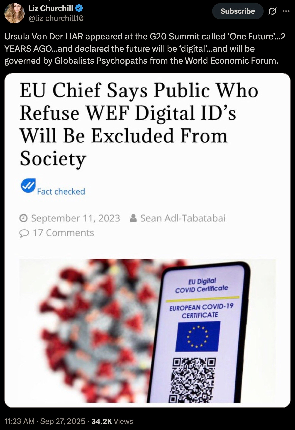 In a world where this digital ID exists, the young lady in the aforementioned video receives an instant penalty in her cashless world of Universal Basic Income (UBI), her bug gruel and tumorigenic synthetic meat rations are then reduced by some AI-determined percentage, and her credit score precipitously drops because patriotism is bad and climate change…